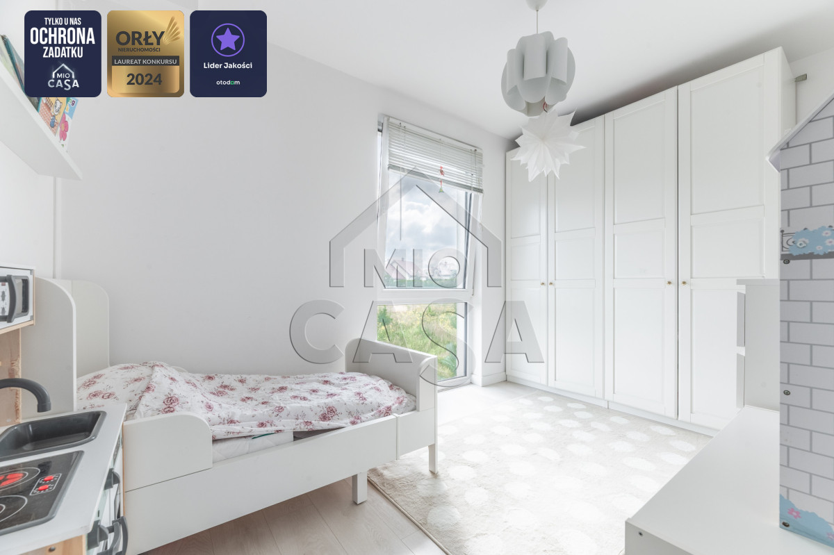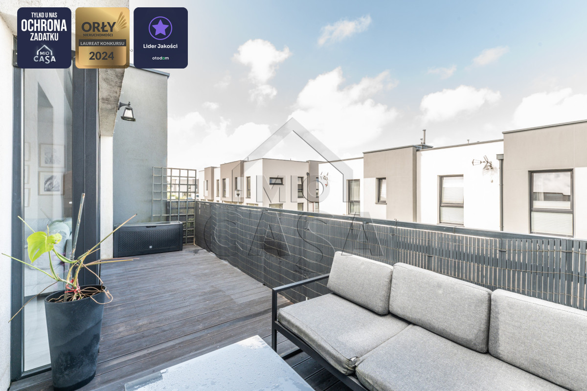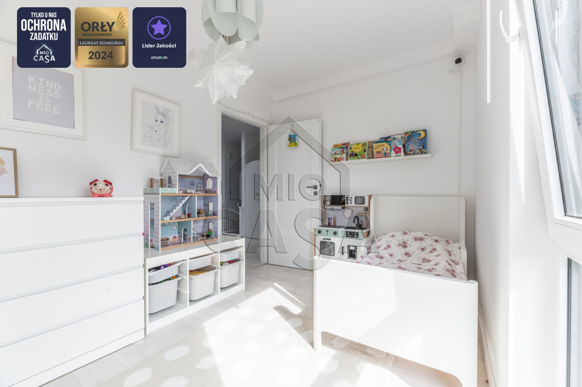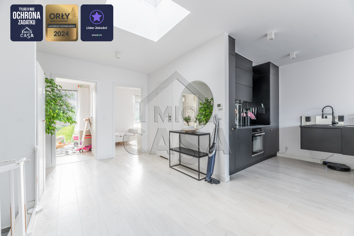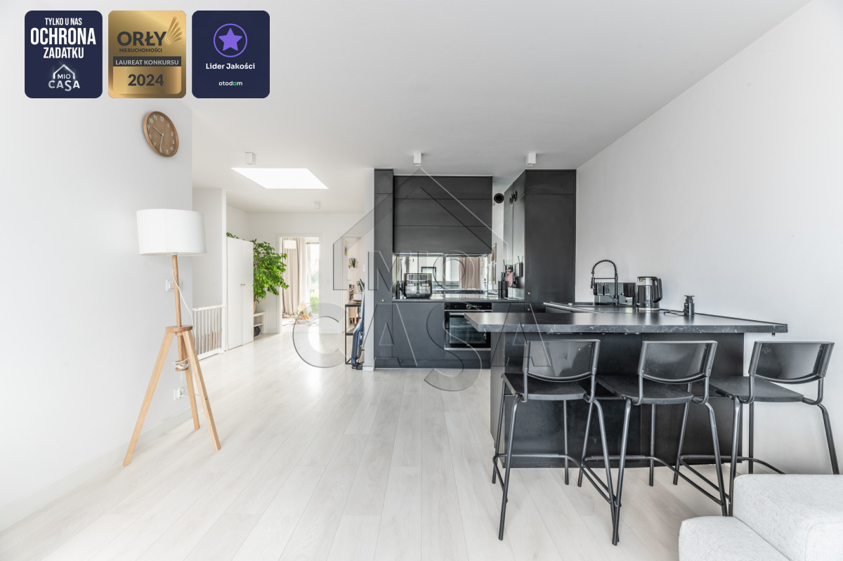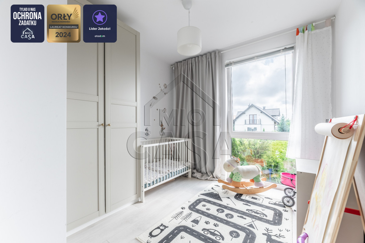 - apartament – znajduje się w nowoczesnej zabudowie szeregowej na pierwszym piętrze. Jego powierzchnia to 74 m2, w skład których wchodzą: przestronny salon z aneksem kuchennym, sypialnia, dwa pokoje zaaranżowane na pokoje dziecięce, łazienka, pomieszczenie gospodarcze oraz unikatowy, naprawdę duży taras. Mieszkanie posiada ekspozycję wschodnią oraz zachodnią – światło do południa jest od strony dwóch pokoi dziecięcych, natomiast przez całe popołudnie znajduje się po stronie salonu, sypialni oraz tarasu. Sprawia to doświetlenie ciepłym, intymnym i sprzyjającym relaksowi światłem. Okna w każdym z pomieszczeń sięgają od podłogi aż po sufit a w samym salonie znajdują się na całej ścianie – dzięki temu ekspozycja słoneczna wykorzystana jest maksymalnie. W korytarzu dodatkowo zainstalowany jest świetlik. Na taras można wyjść zarówno z salonu jak i sypialni. Apartament jest komfortowy, jasny i ciepły, został urządzony ze smakiem, posiada unikatowy charakter. Znajdziemy tu ogrzewanie gazowe – podłogowe, które w tym wypadku będzie miało oszczędny charakter. Wynika to z faktu sąsiadów po bokach ale i tych z parteru, innymi słowy mieszkanie jest grzane z każdej strony. Na osiedlu zawiązana jest wspólnota – miesięczna opłata wynosi 180 zł i obejmuje zarządzanie częściami wspólnymi, fundusz remontowy i wywóz śmieci. Pozostałe opłaty to standardowe media według zużycia. Nowy właściciel będzie miał możliwość wprowadzenia się po około 2-3 tygodniach od momentu umowy końcowej.