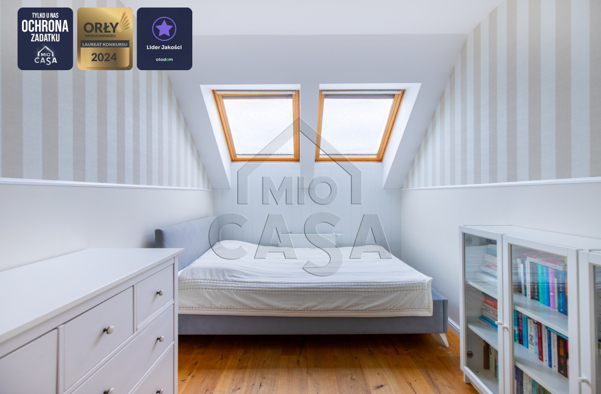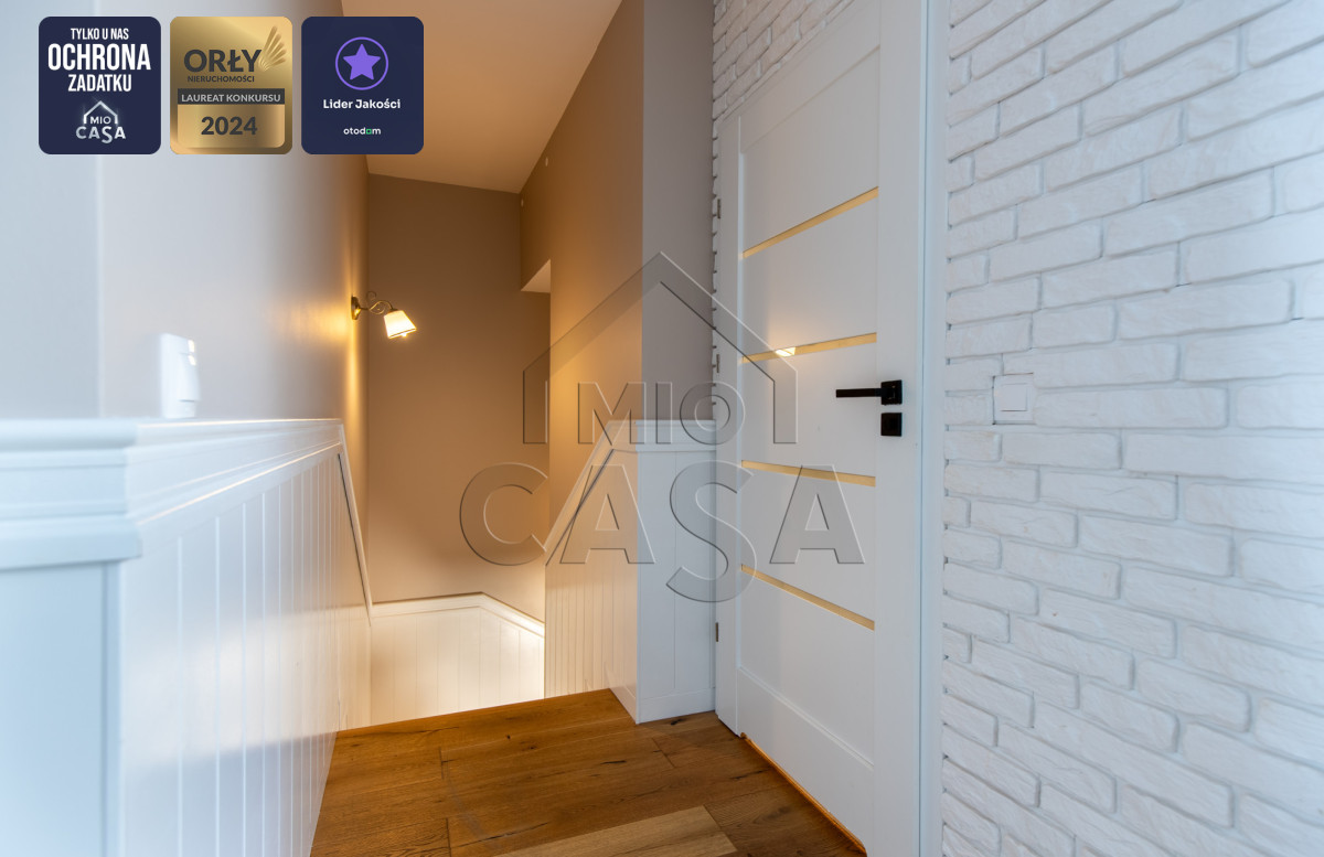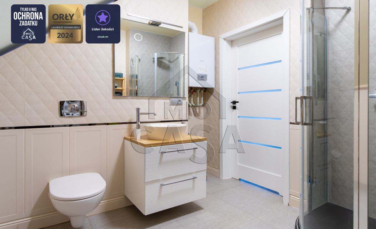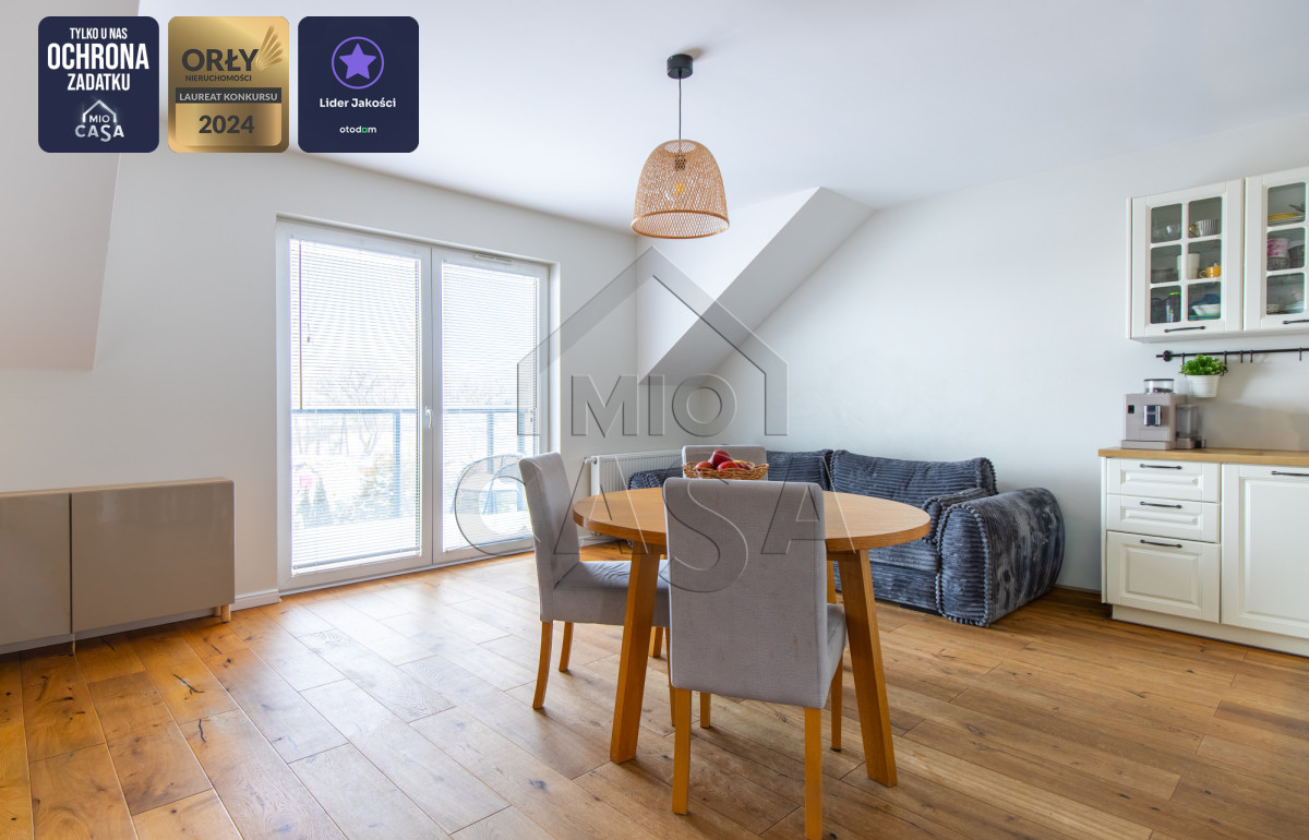 Do mieszkania wchodzi się własną klatką schodową, w której znajduje się przestrzeń na małe pomieszczenie gospodarcze/garderobę – idealne do przechowywania ubrań zimowych, butów, czy walizek. Na pierwszym piętrze znajduje się bardzo duży salon z nowoczesnym aneksem kuchennym i wyjściem na balkon, łazienka z prysznicem, pokój dziecięcy oraz sypialnią. Dodatkową przestrzenią do wykorzystania na sypialnie lub gabinet jest użytkowe poddasze, na które można dostać się drewnianymi schodami. Ekspozycja okien na dwie strony świata, dzięki czemu mieszkanie jest dobrze oświetlone o każdej porze dnia. Dzięki swojej funkcjonalności, mieszkanie można zaaranżować zgodnie ze swoimi potrzebami. Przed wejściem do mieszkania znajduje się miejsce postojowe dla samochodu.