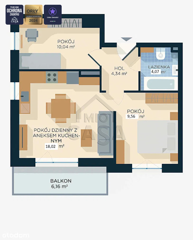 - powierzchnia mieszkania to 47,83 m2, w skład którego wchodzi duży salon z aneksem kuchennym, dwie sypialnie, nowoczesna łazienka oraz hol,