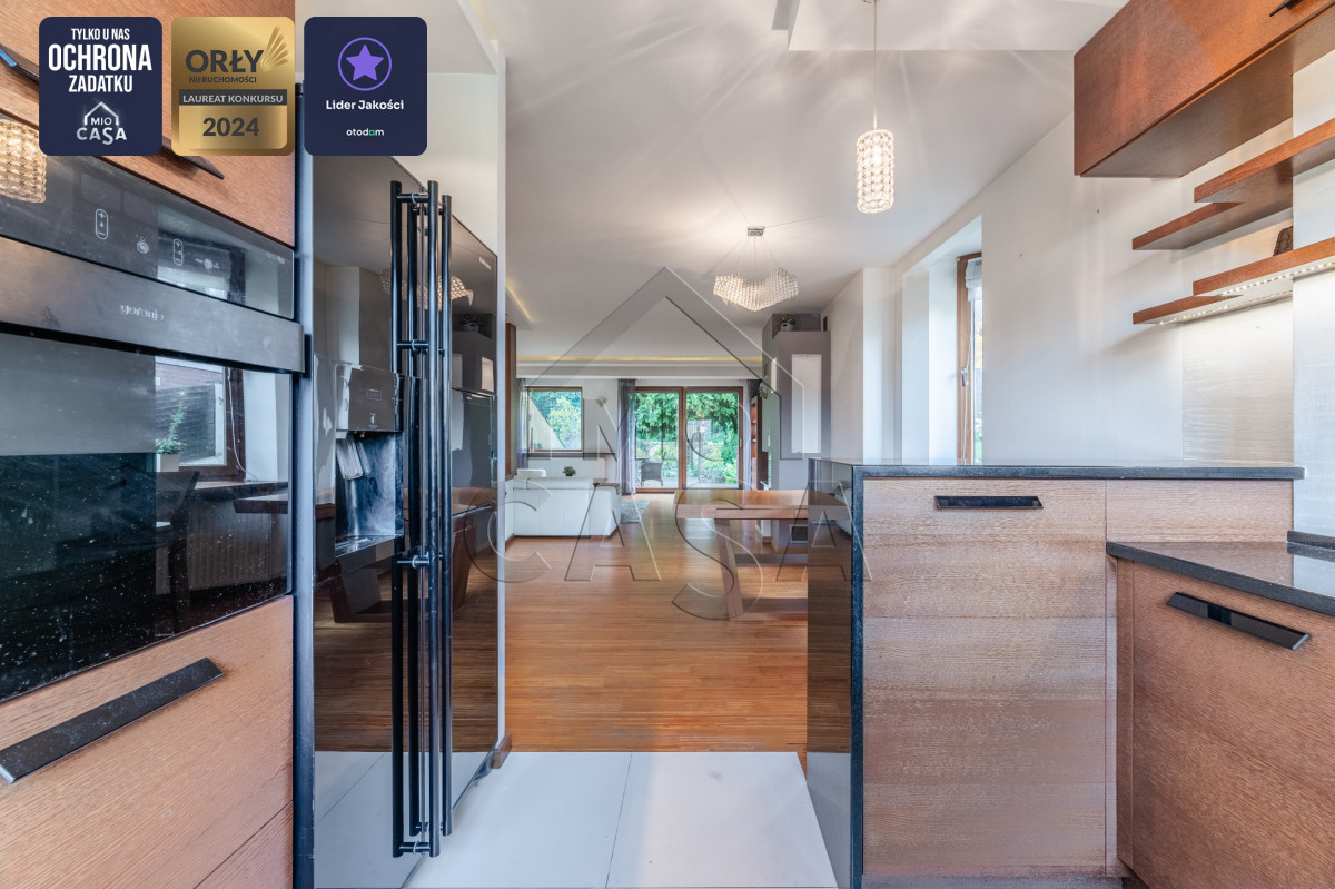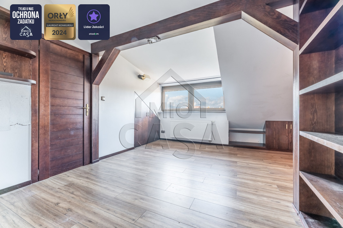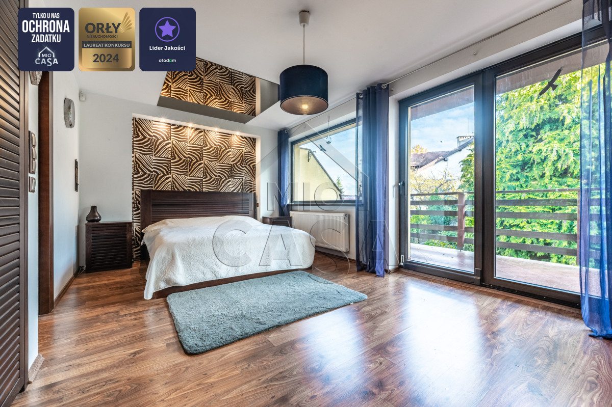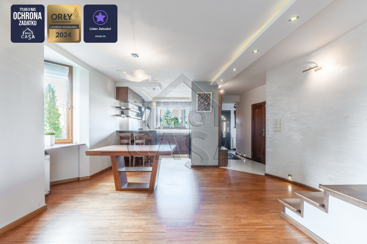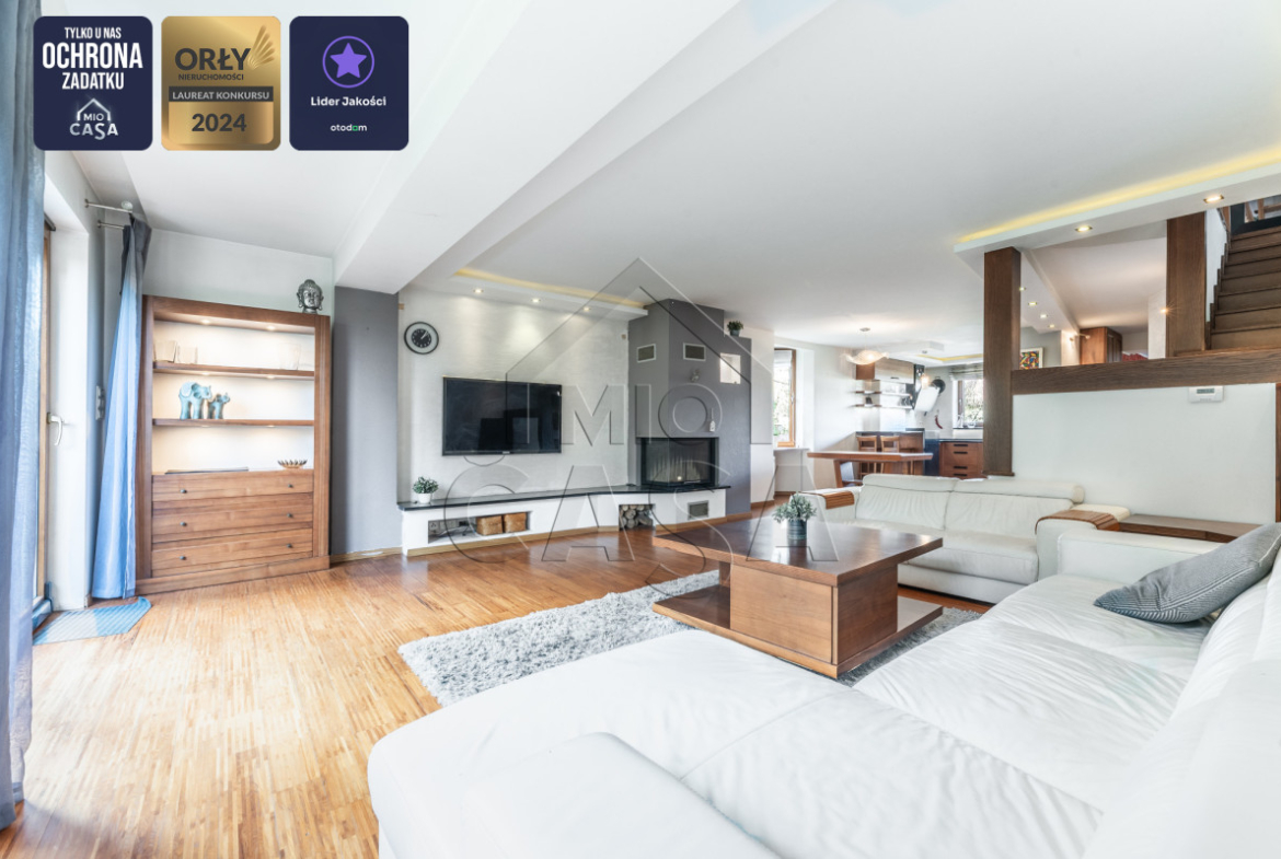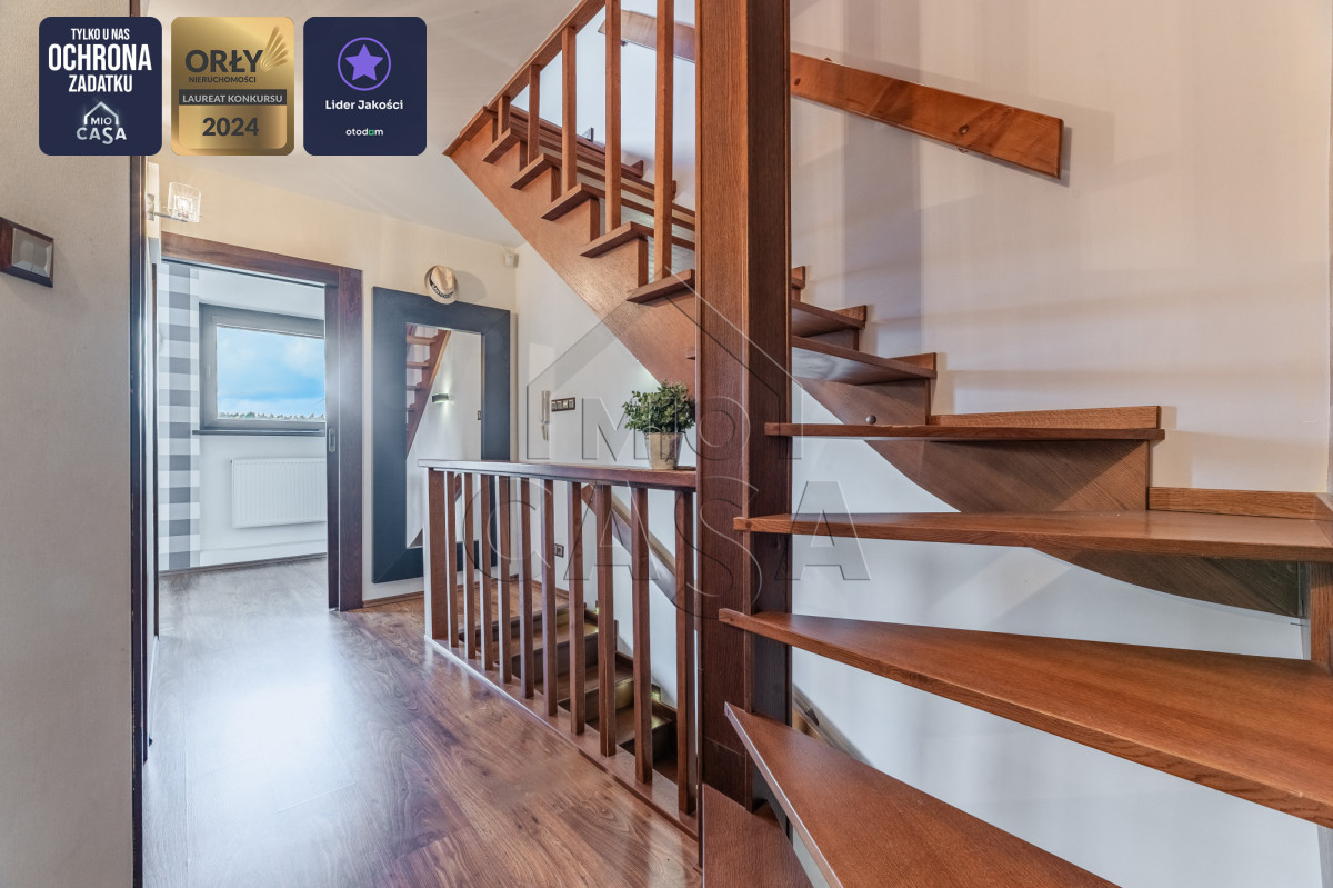 Szanowni Państwo, serdecznie zapraszam do zapoznania się z ofertą wyjątkowego domu w zabudowie szeregowej (skrajnego), o powierzchni 240 m2, z trzema piętrami użytkowymi, salonem i czterema sypialniami, trzema łazienkami, tarasem i balkonem, pięknym ogrodem oraz garażem z pomieszczeniami gospodarczymi. Nieruchomość znajduje się na ulicy Miętowej, w cichej i spokojnej okolicy blisko lasu, w dzielnicy Dąbrowa.