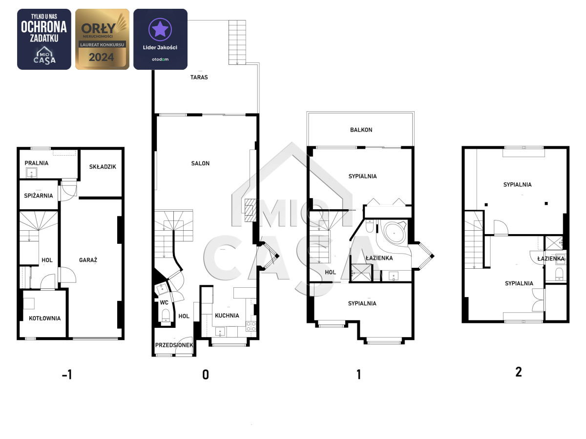 * -1 – garaż, kotłownia, spiżarnia, pralnia, pomieszczenie gospodarcze, hol,