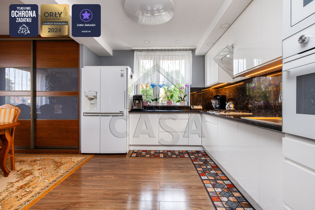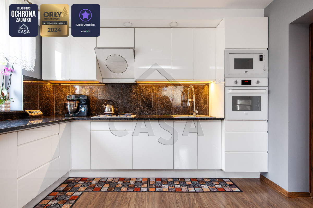 - Kuchnia po generalnym remoncie – wyposażona w wysokiej klasy zabudowę i blaty z kamienia naturalnego,