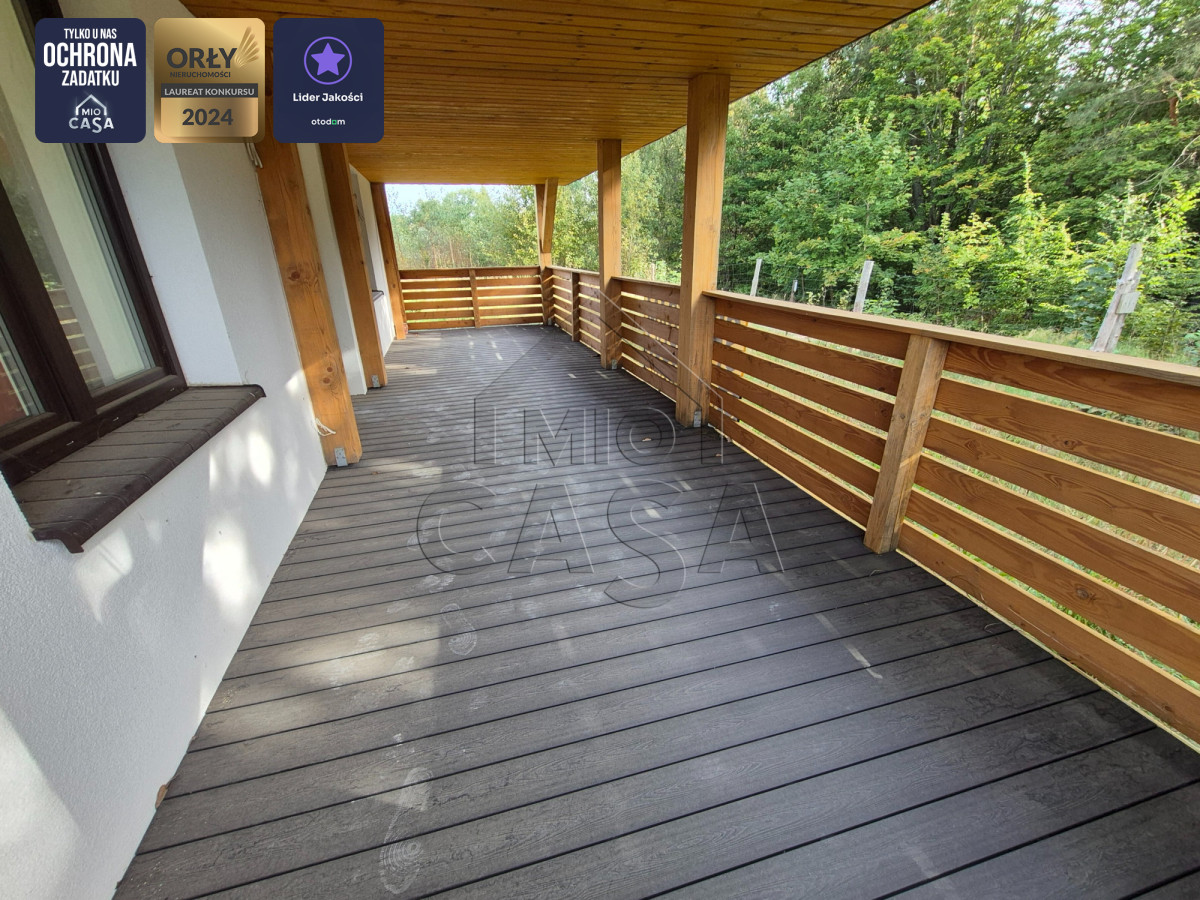 - słoneczny salon z wyjściem na drewnianą, zadaszoną werandę – idealne miejsce na letnie wieczory,