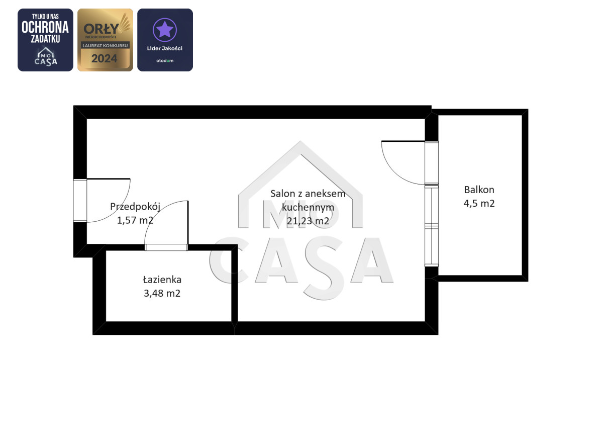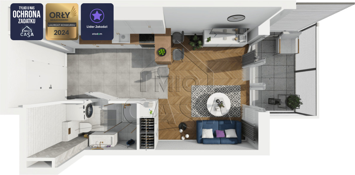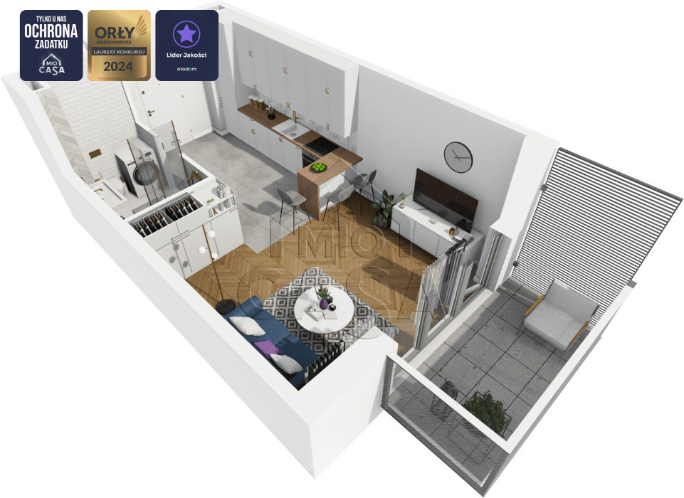Mieszkanie składa się z przestronnego pokoju dziennego z aneksem kuchennym oraz łazienki. Funkcjonalny balkon pozwala na relaks na świeżym powietrzu. Dzięki przemyślanemu rozkładowi, nieruchomość jest dobrze doświetlona i przestronna.