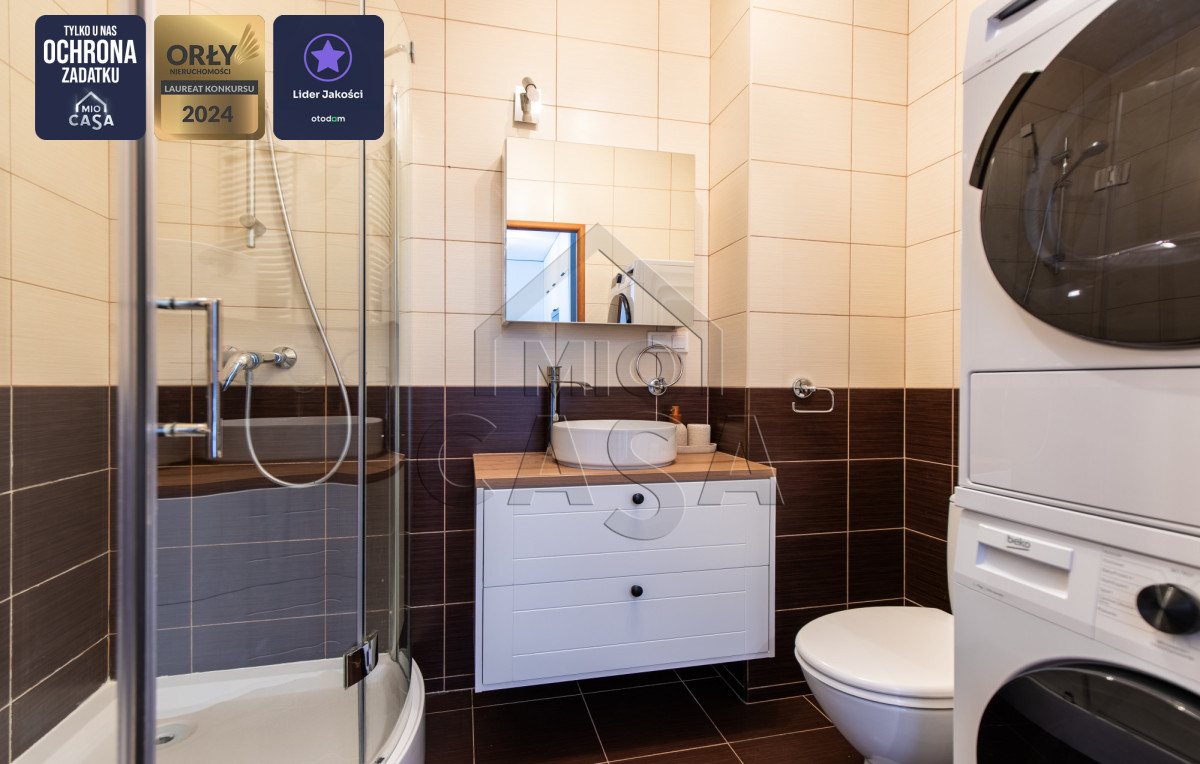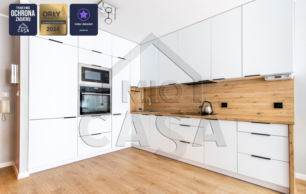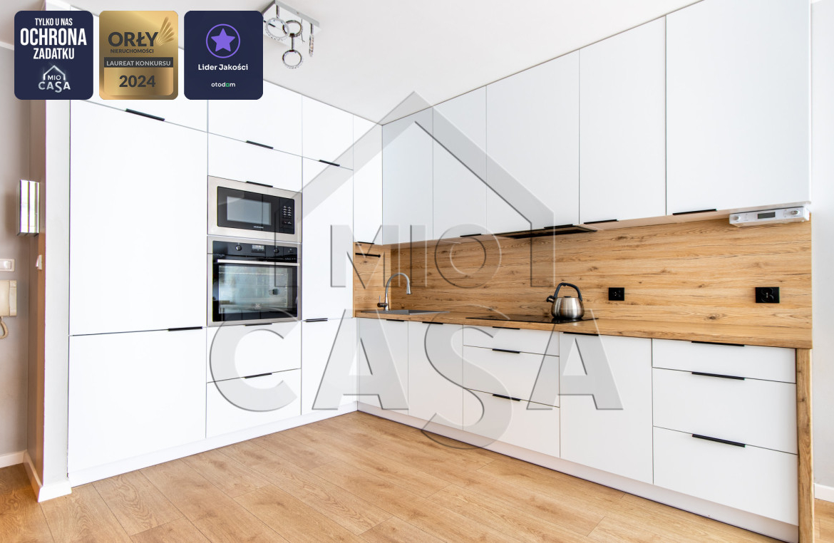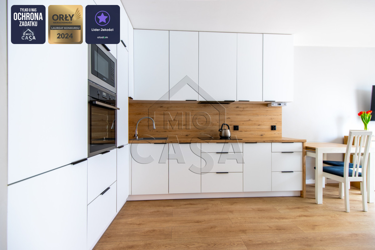 Sercem mieszkania jest jasny salon z przestronnym i bardzo funkcjonalnym aneksem kuchennym, wykonanym na indywidualne zamówienie, oferującym dużą ilość miejsca do przechowywania. Mieszkanie posiada również kompaktową, ale ustawą sypialnię. Dodatkowo w przedpokoju również przewidziano praktyczną przestrzeń do przechowywania. Łazienka wyposażona jest w duży prysznic oraz posiada wystarczająco dużo miejsca na zabudowę pralki i suszarki. Dodatkowym atutem jest duży balkon z ekspozycją wschodnią, idealny na poranną kawę.
