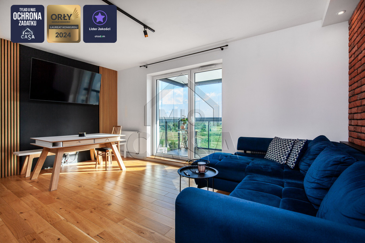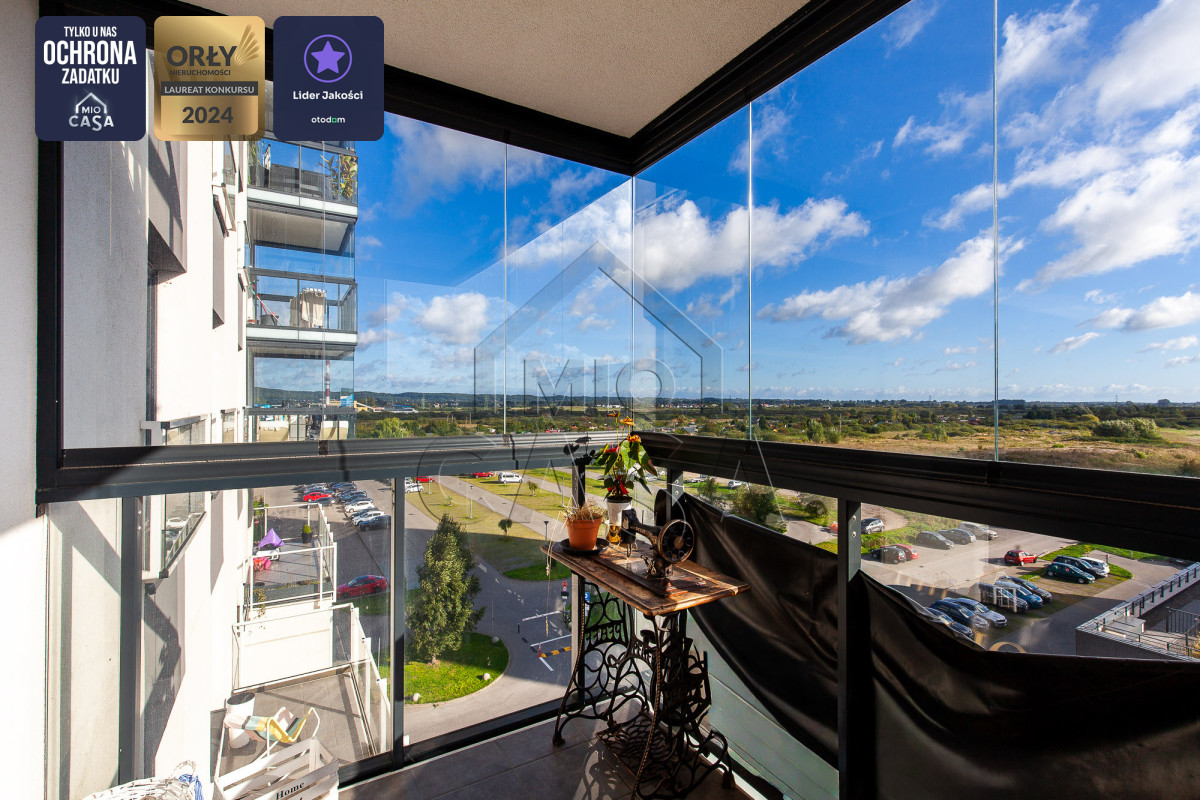 - Przestronny balkon ze szklaną zabudową, idealny do wypoczynku przez cały rok, chroniący przed wiatrem i hałasem,