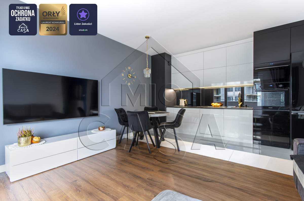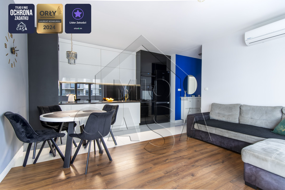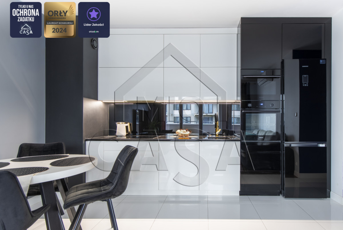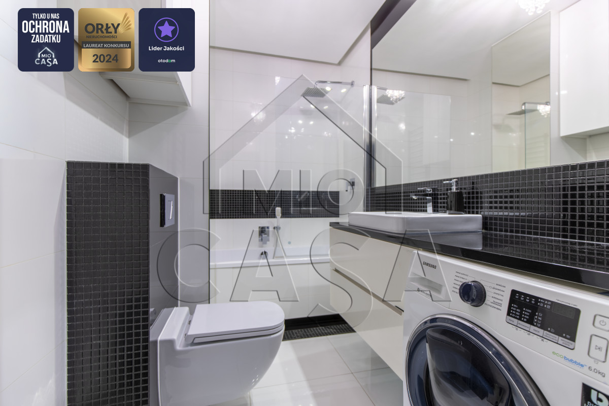 Znajdziemy tu sprzęty marki SAMSUNG, blat granitowy w kuchni, drewniane drzwi wewnętrzne marki Pol-Skone, a także elegancką łazienkę z wanną, prysznicem i dużymi lustrami, które dodają przestronności.