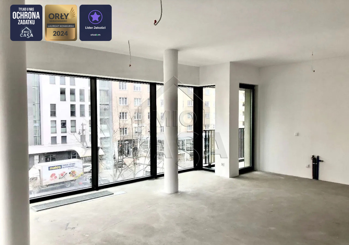 Głównym punktem mieszkania jest imponujący, przeszklony salon z aneksem kuchennym, zajmujący aż 44,92 m². Panoramiczne okna zapewniają mnóstwo naturalnego światła, oferując jednocześnie przepiękne widoki na reprezentacyjny Plac Kaszubski. Apartament wyróżnia się dużą przestrzenią i wysokimi, 3-metrowymi sufitami, co potęguje poczucie komfortu. Z salonu prowadzi wyjście na balkon z widokiem na Plac Kaszubski.
