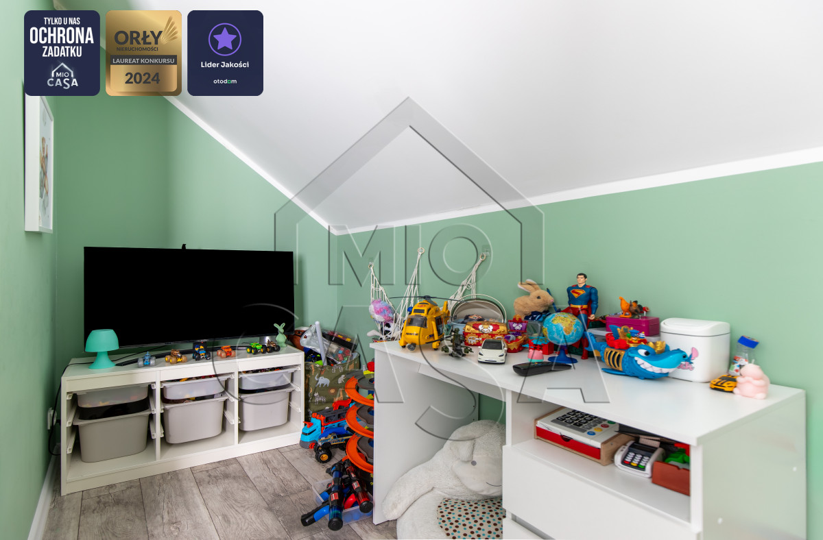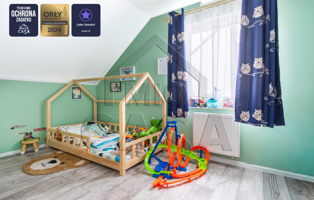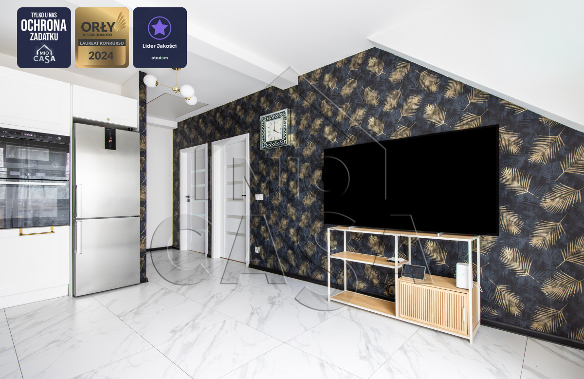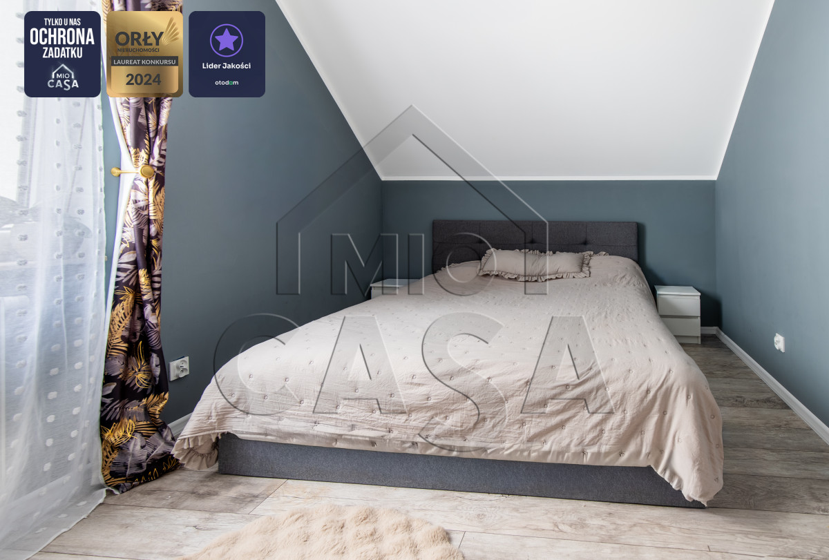 Do mieszkania wchodzi się własną klatką schodową, w której znajduje się przestrzeń na małe pomieszczenie gospodarcze/garderobę – idealne do przechowywania ubrań zimowych, butów, czy walizek. Na pierwszym piętrze znajduje się bardzo duży salon z nowoczesnym aneksem kuchennym i wyjściem na balkon, łazienka z prysznicem oraz wanną, pokój dziecięcy oraz sypialnią. Dodatkową przestrzenią do wykorzystania na sypialnie lub gabinet jest nieużytkowe poddasze, na które można dostać się drewnianymi schodami. Wyposażenie mieszkania w cenie nieruchomości. Dzięki swojej funkcjonalności, mieszkanie można zaaranżować zgodnie ze swoimi potrzebami. Przed wejściem do mieszkania znajduje się miejsce postojowe dla samochodu.