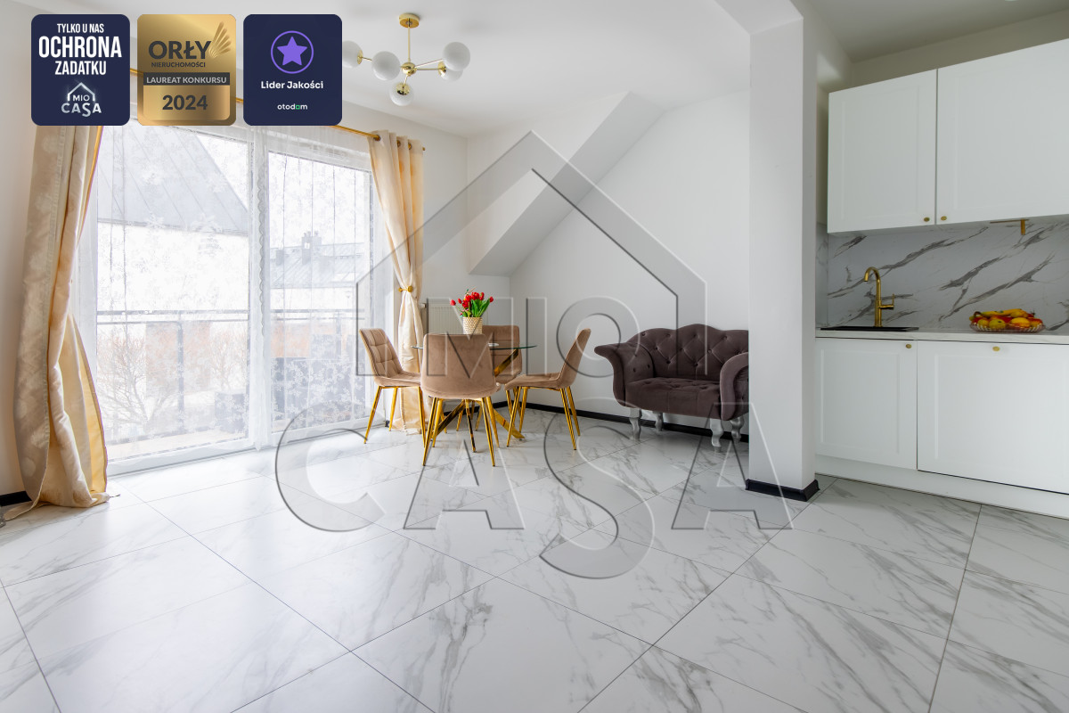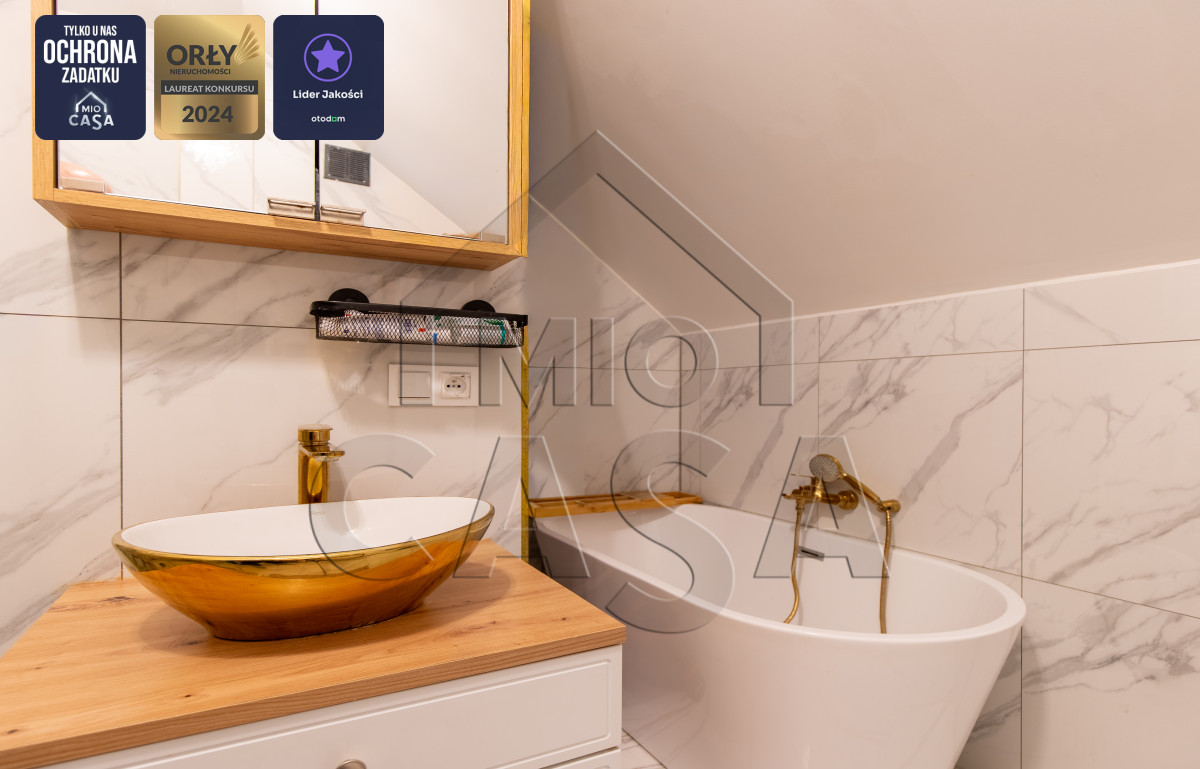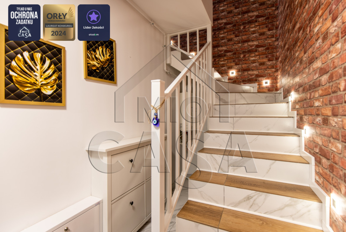 Do mieszkania wchodzi się własną klatką schodową, w której znajduje się przestrzeń na małe pomieszczenie gospodarcze/garderobę – idealne do przechowywania ubrań zimowych, butów, czy walizek. Na pierwszym piętrze znajduje się bardzo duży salon z nowoczesnym aneksem kuchennym i wyjściem na balkon, łazienka z prysznicem oraz wanną, pokój dziecięcy oraz sypialnią. Dodatkową przestrzenią do wykorzystania na sypialnie lub gabinet jest nieużytkowe poddasze, na które można dostać się drewnianymi schodami. Wyposażenie mieszkania w cenie nieruchomości. Dzięki swojej funkcjonalności, mieszkanie można zaaranżować zgodnie ze swoimi potrzebami. Przed wejściem do mieszkania znajduje się miejsce postojowe dla samochodu.