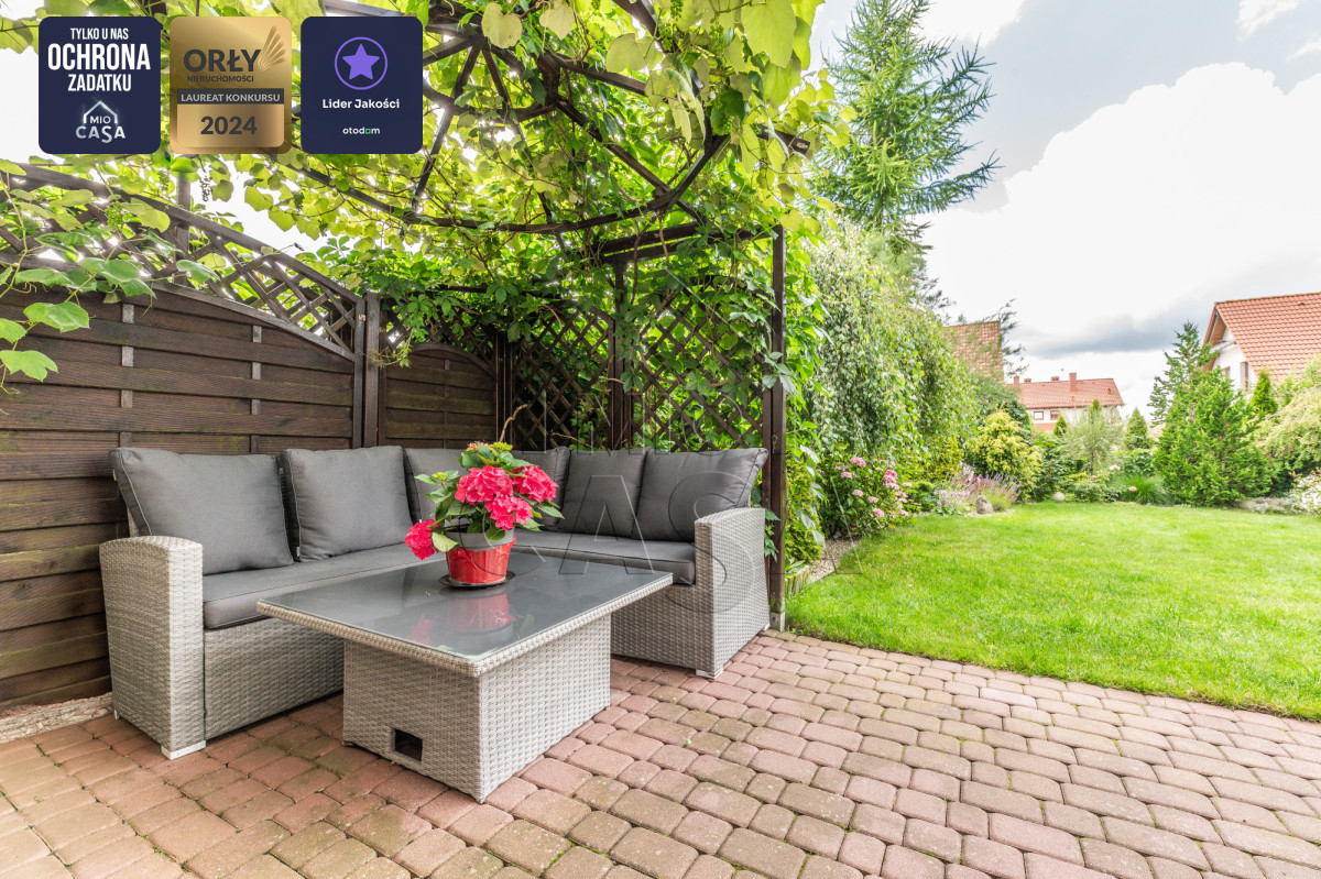 Klomby wyłożone sa agrowłókniną oraz grysem ozdobnym. W rogu ogrodu znajduje się kącik wypoczynkowy z pergolą obsadzoną winoroślą. Ogród wyposażony jest w system oświetlenia z iluminacją świetlną. Wysokie obsadzenia obrzeży ogrodu zapewniają pełną prywatność oraz komfort wypoczynku.