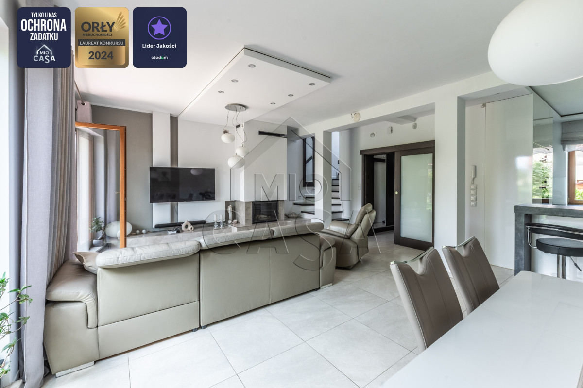 - Salon z jadalnią (32,5 m²) i kominkiem, dwa wyjścia na taras od strony południowo-zachodniej,