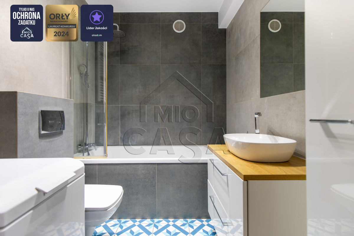 przestronny salon z aneksem kuchennym oraz wyjściem na balkon, w pełni wyposażona wykonana na zamówienie kuchnia, sypialnia z dużą szafą w zabudowie, łazienka z wanną oraz przedpokój.