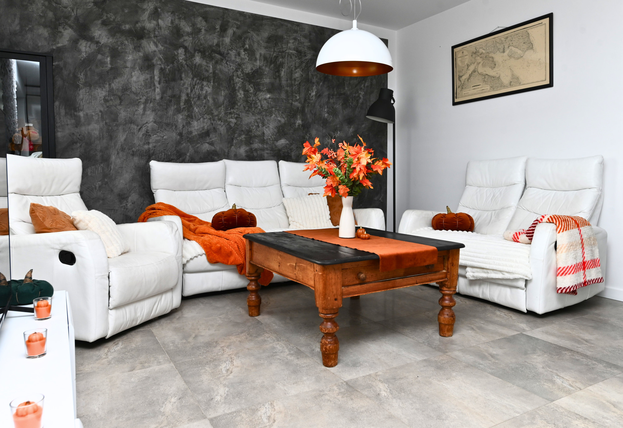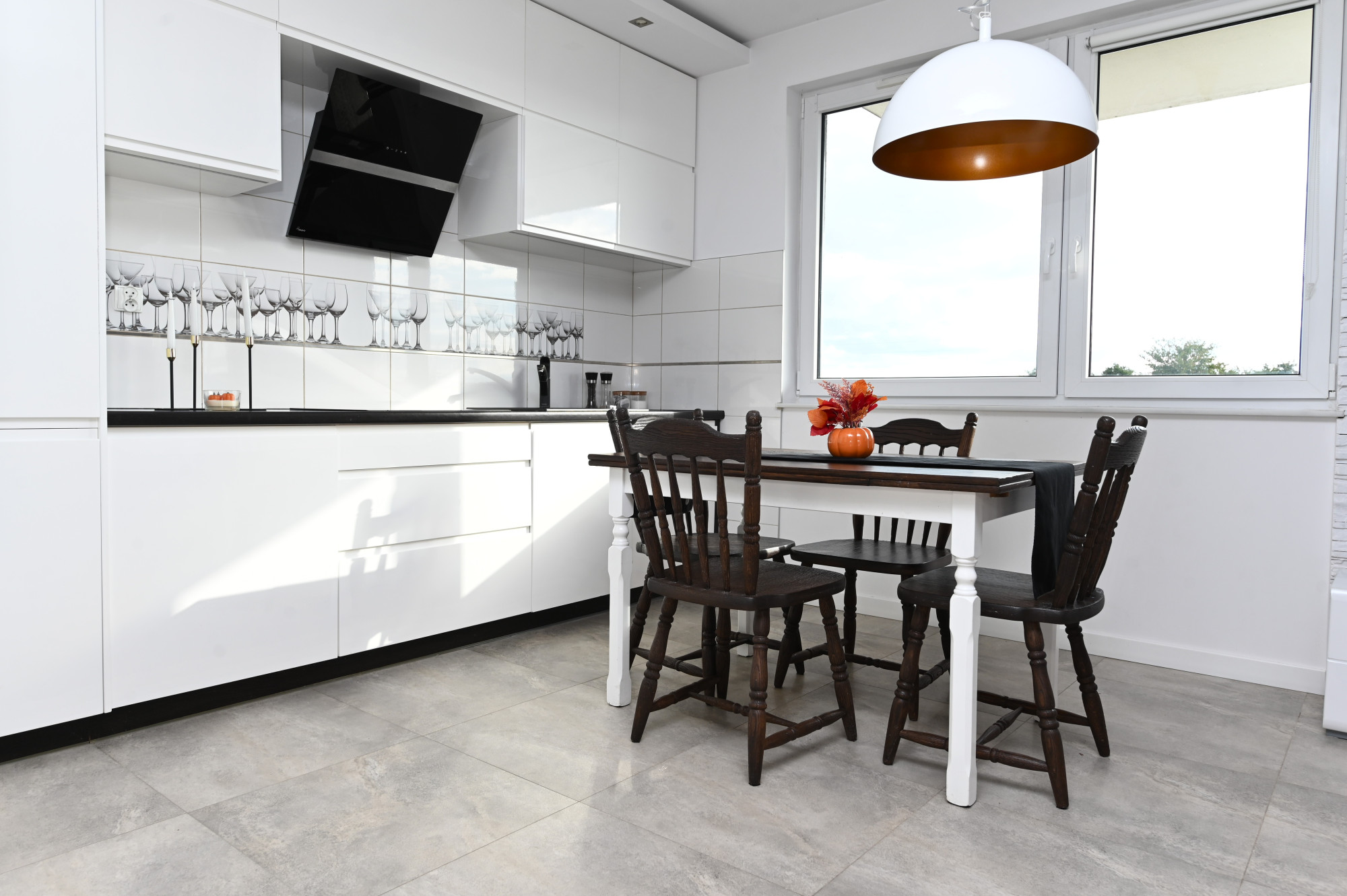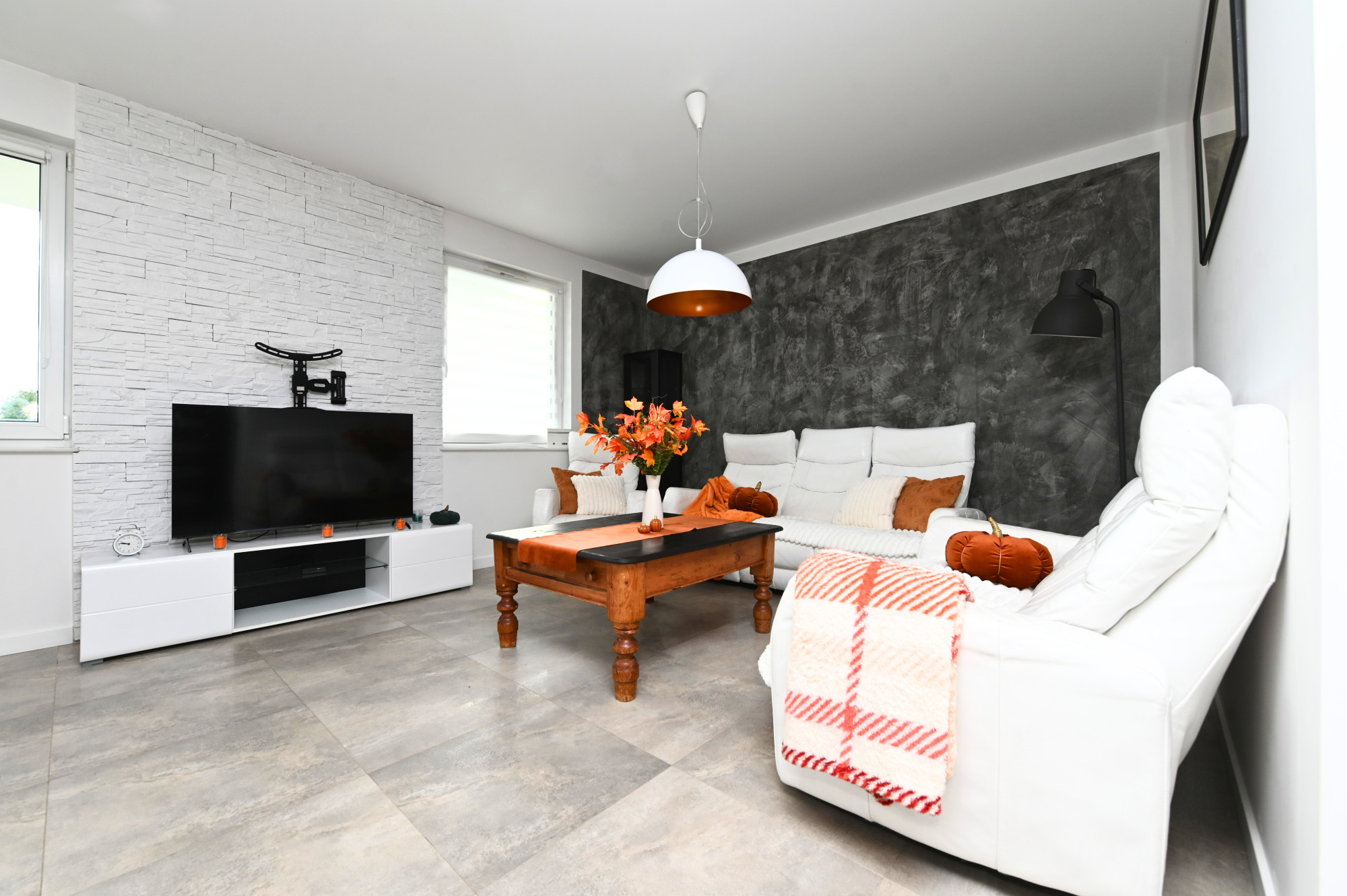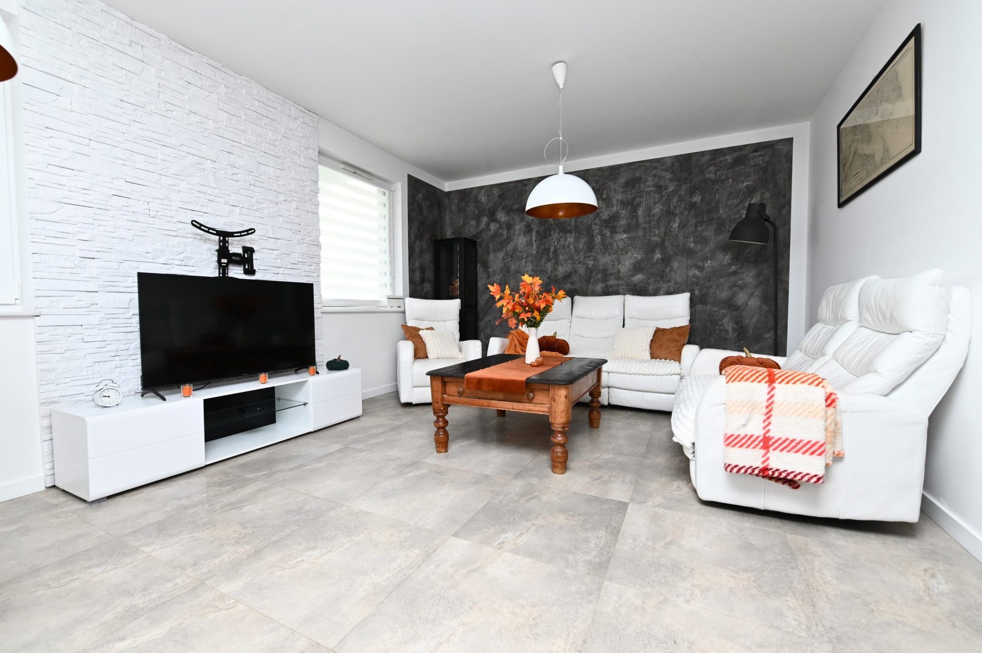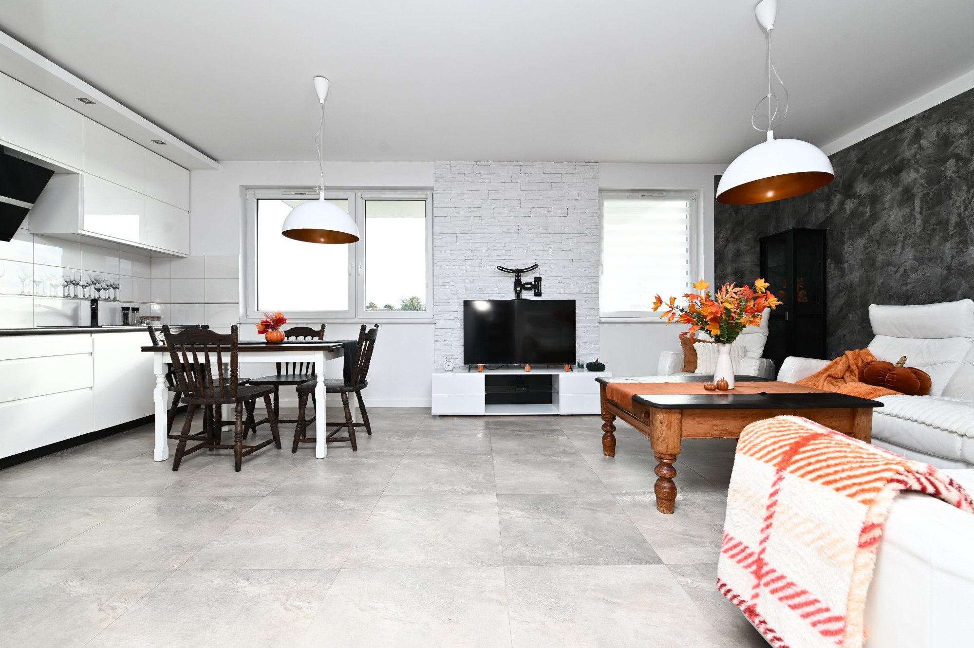 - Jasny salon połączony z aneksem kuchennym i częścią jadalną,