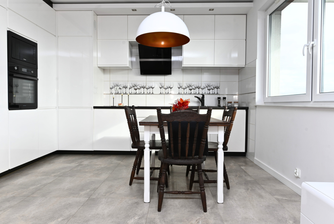 Kuchnia wyposażona w pełny sprzęt AGD: zmywarka, płyta indukcyjna, piekarnik, lodówka z zamrażarką, okap, mikrofalówka