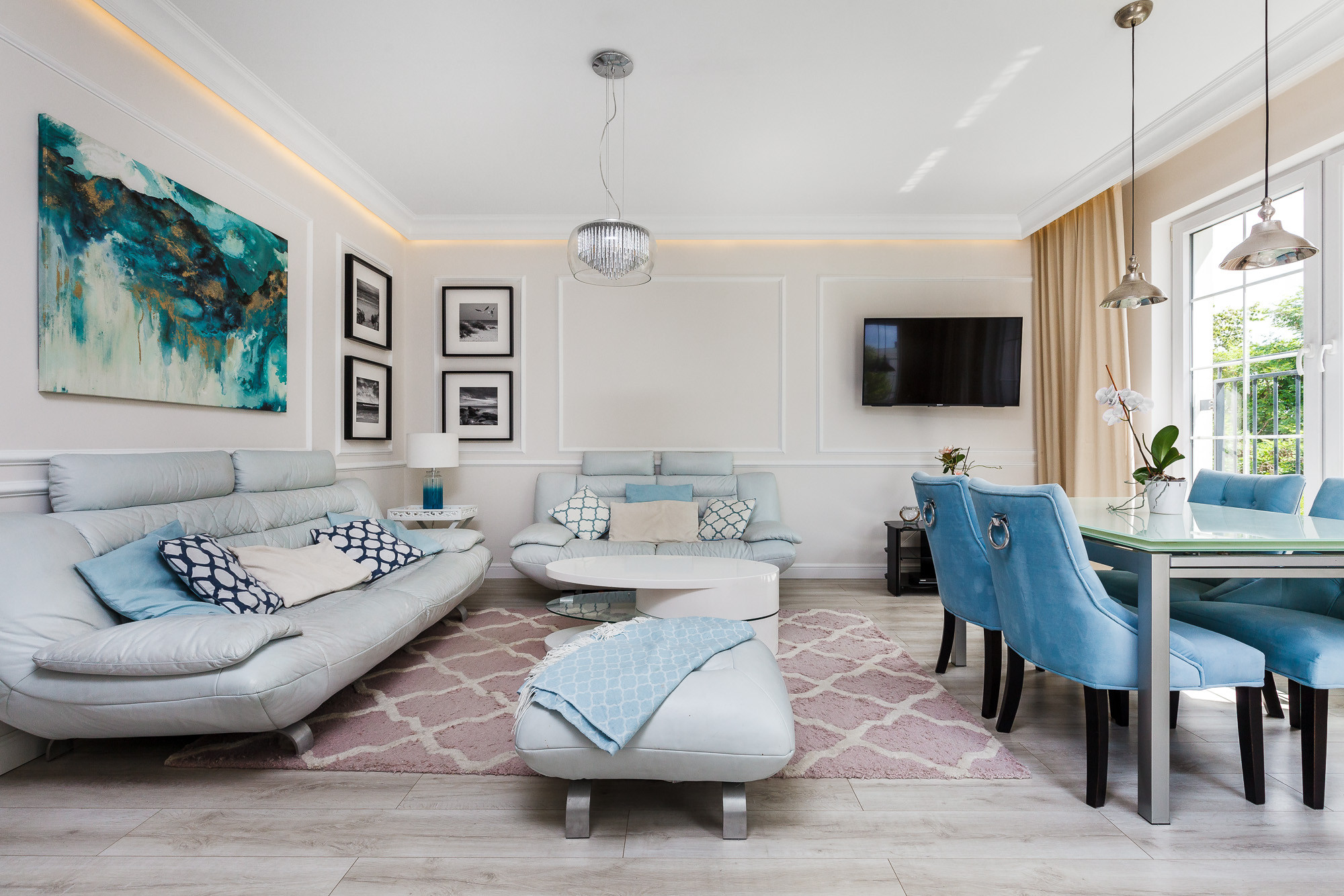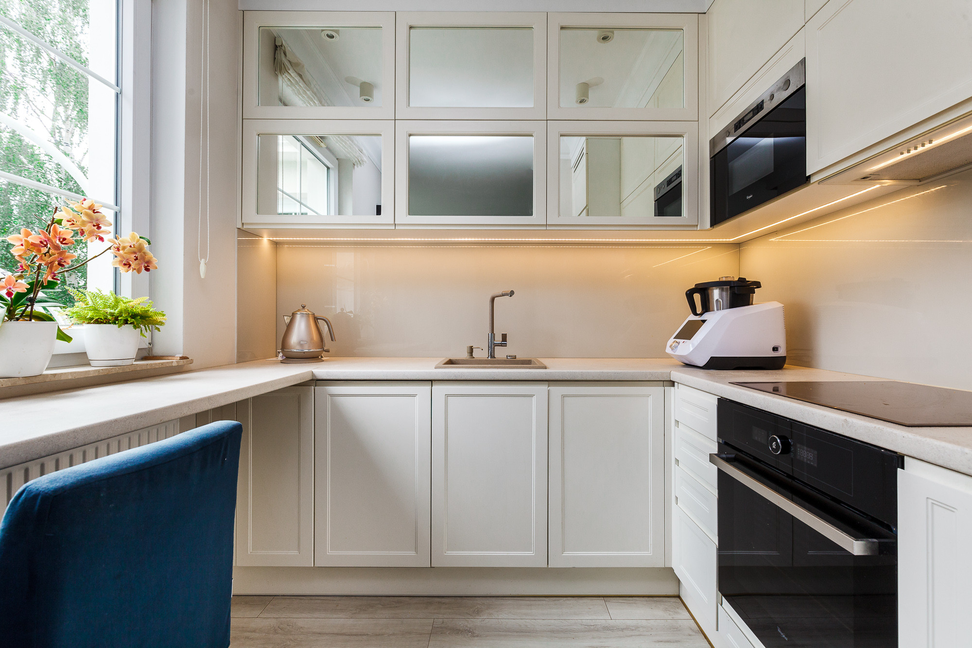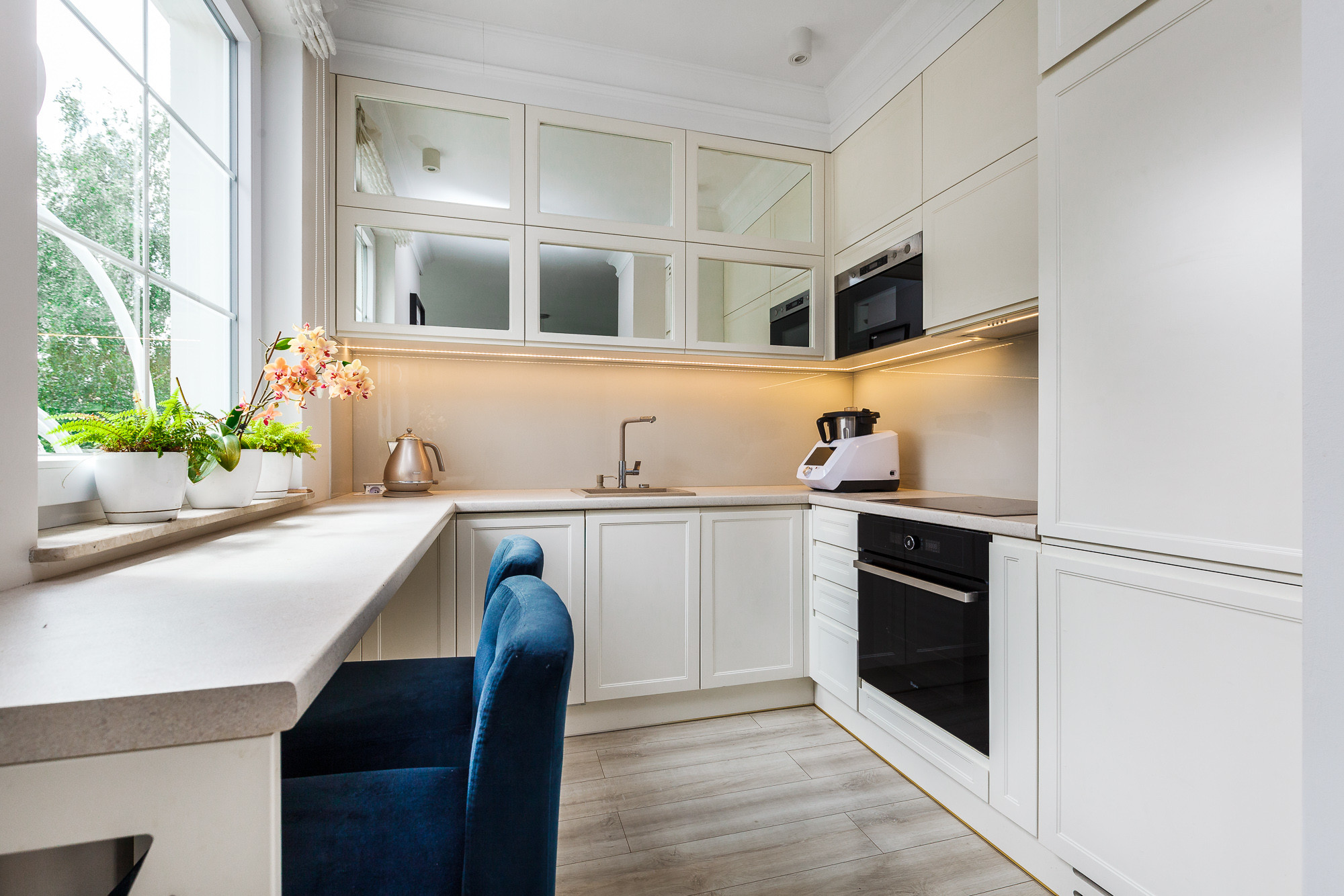 - Salon z aneksem kuchennym to serce apartamentu – jasny, przestronny i doskonale doświetlony. Kuchnia została starannie zaprojektowana i wykonana na indywidualne zamówienie, z wydzieloną częścią roboczą i funkcjonalną strefą jadalną. Z salonu prowadzi wyjście na pierwszy taras, idealny na poranną kawę lub wieczorny relaks.