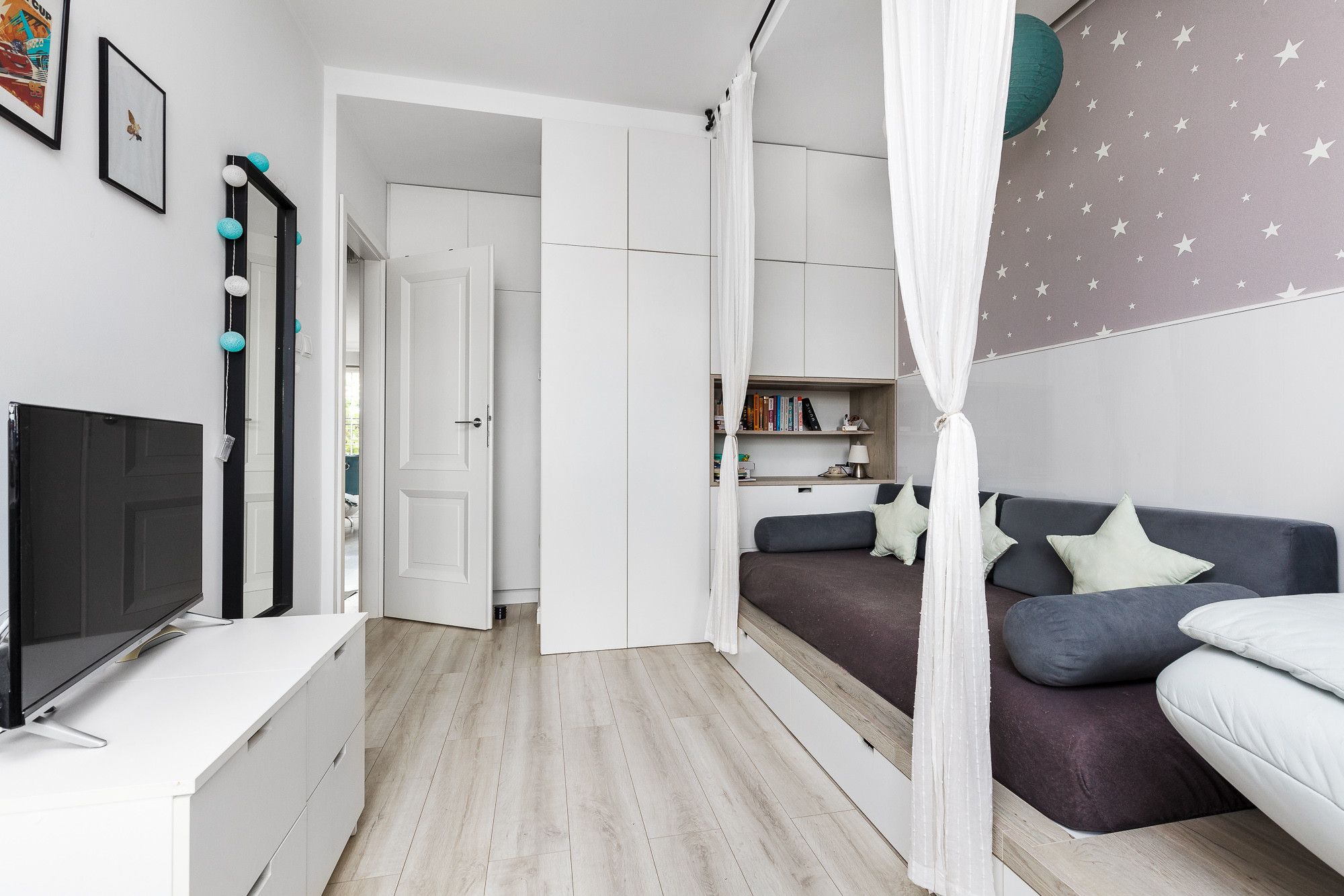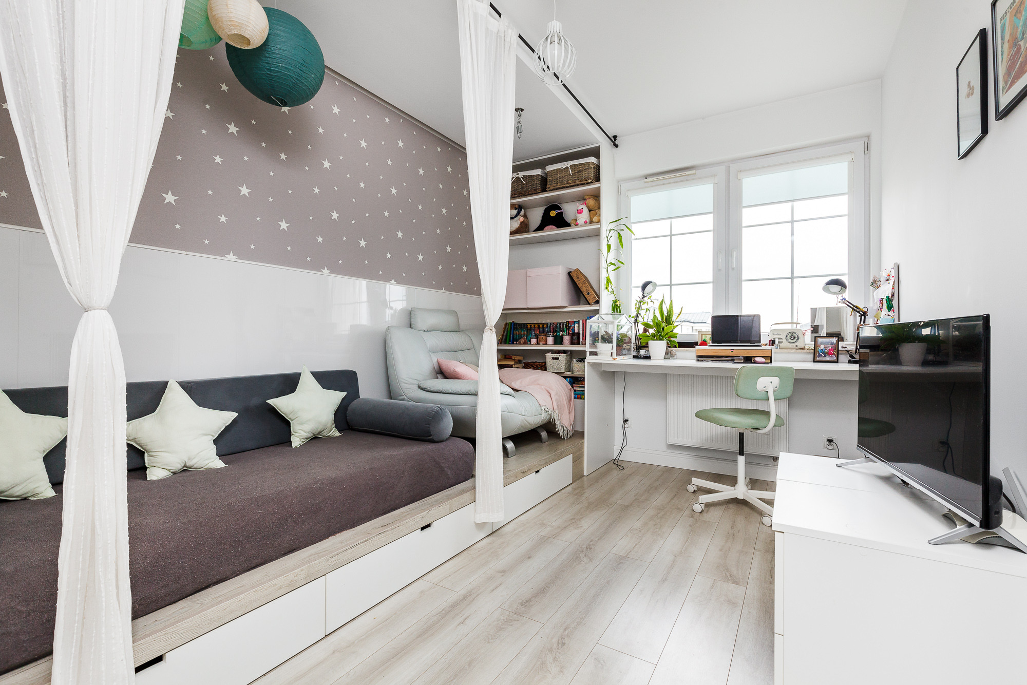 - Duży pokój dziecięcy oferuje wygodną przestrzeń do nauki, zabawy i rozwoju kreatywności najmłodszych domowników.