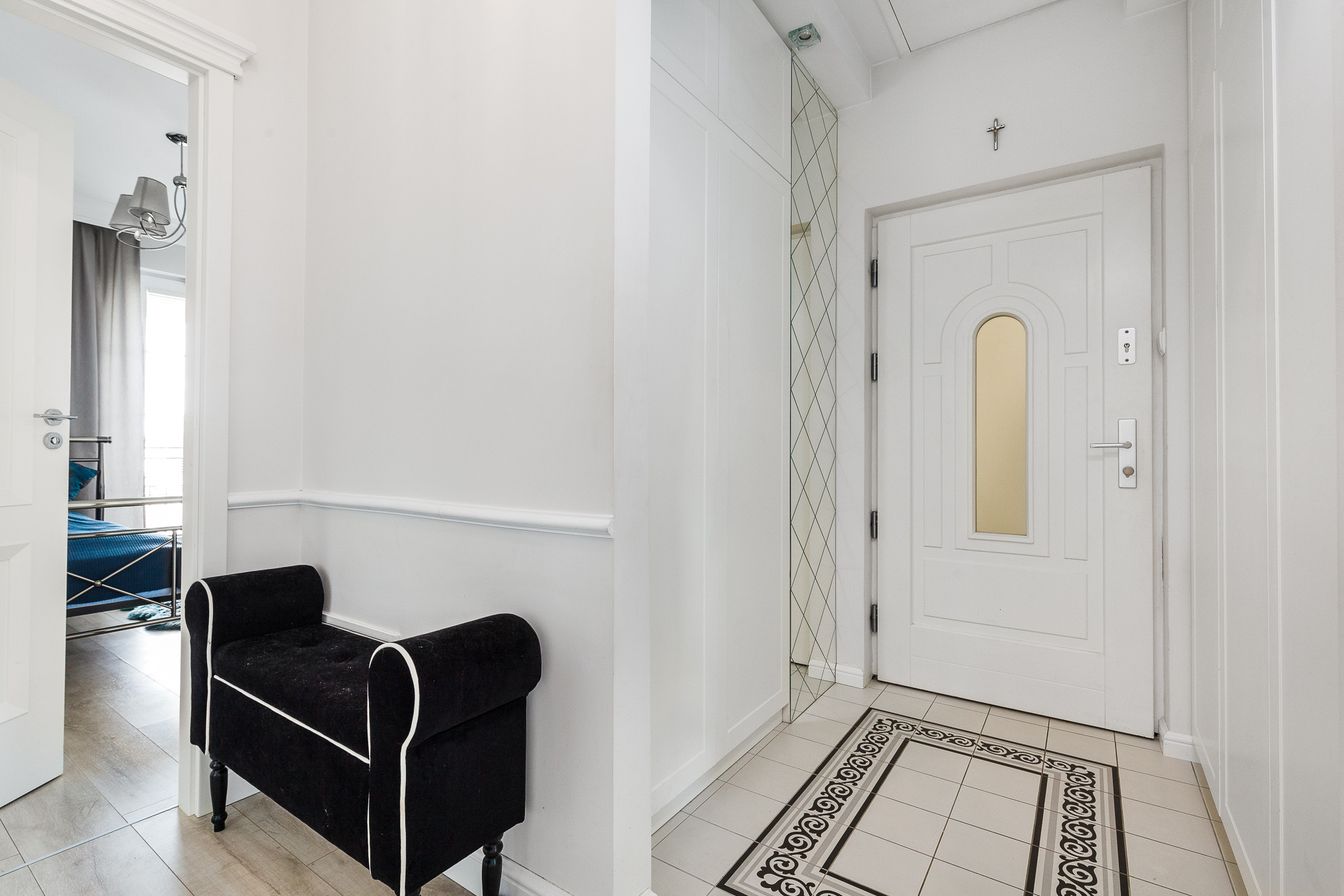 Mieszkanie zostało zaprojektowane z myślą o funkcjonalności i komforcie . Wchodząc do wnętrza, trafiamy do przestronnego wiatrołapu, który pełni także rolę praktycznej strefy przechowywania – znajdują się tu dwie duże szafy: jedna przeznaczona na odzież wierzchnią, druga typu cargo, idealna na buty, sprzęty domowe czy sezonowe akcesoria. Wiatrołap płynnie przechodzi w przedpokój, tworząc wygodną i uporządkowaną strefę wejściową.